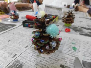 松ぼっくりにビーズや綿をつけてデコレーションをしたりマジックで色をつけました♪