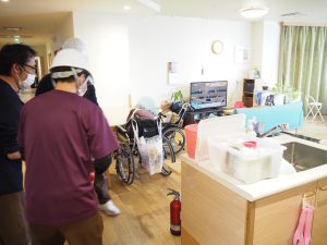 今回は、夜間にユニットのリビングで火災が発生したと想定し、夜勤リーダーを中心に初期消火・