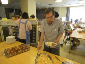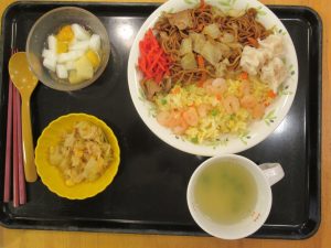 皆様「 焼きそば・チャーハン・シューマイ・杏仁豆腐・中華スープ 」を前に「 どれもみんな