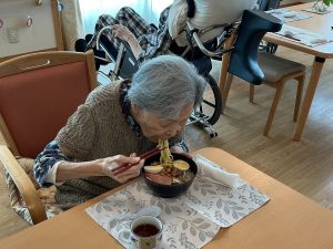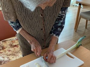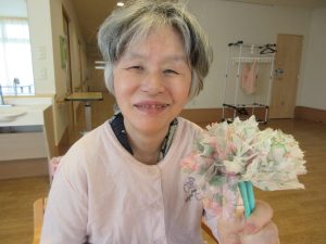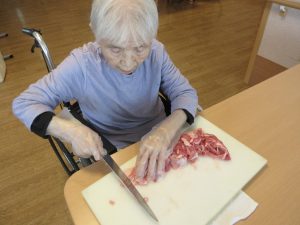 ファッションペーパーを使ってお花飾りを作ったり、入居者様にねぎやお肉を切ってもらい
