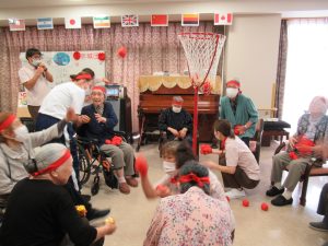 入居者様代表による選手宣誓が行われた後、赤城団と榛名団に分かれて玉入れを競い合いました。