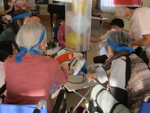 午前と午後の2部制で赤組と青組に別れ、パン( お菓子 )食い競争と風船パタパタゲームで熱く