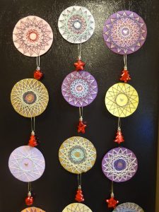 丸い台紙に順番に糸を掛けて幾何学模様の「 糸掛けアート壁飾り 」を作りました!!